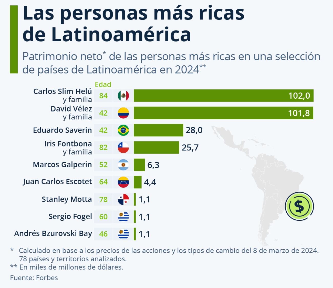 - Carlos Slim Helú y familia (México): Con una riqueza de aproximadamente 100.800 millones de dólares, el magnate y empresario mexicano es considerado el hombre más rico de toda la región y se ubica en la posición decimocuarto en el mundo. Además, Slim, de 84 años, cuenta con el 76 % del Grupo Carso, uno de las corporaciones más grandes y relevantes de Latinoamérica. También junto a su familia dirigen América Móvil, la empresa de telecomunicaciones móviles más grande del continente.