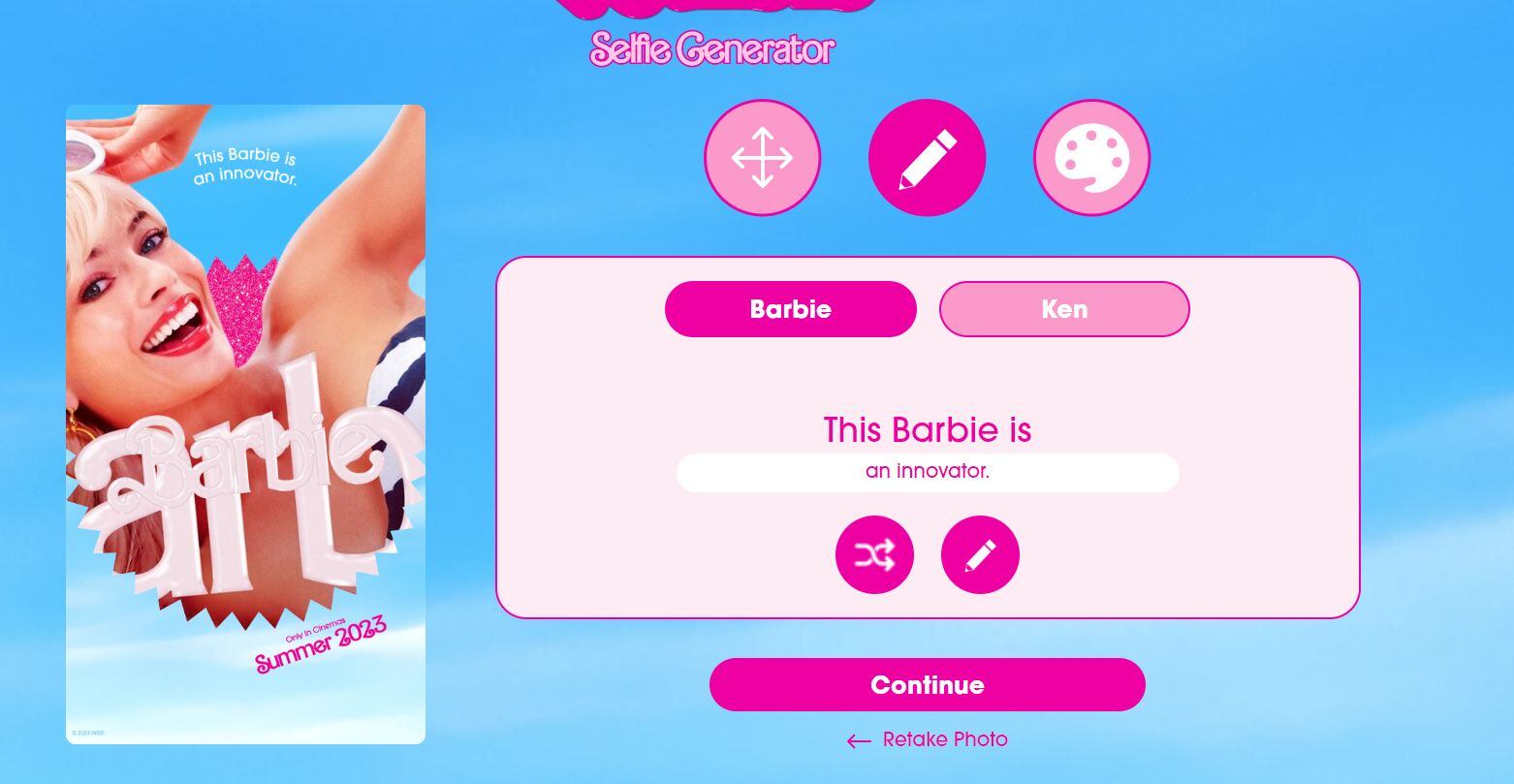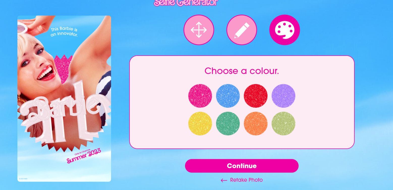 Paso 4: Ponle estilos. El app te permitirá seleccionar si deseas que tu poster sea para ‘Ken’ o para ‘Barbie’. También podrás elegir los colores de tu afiche.