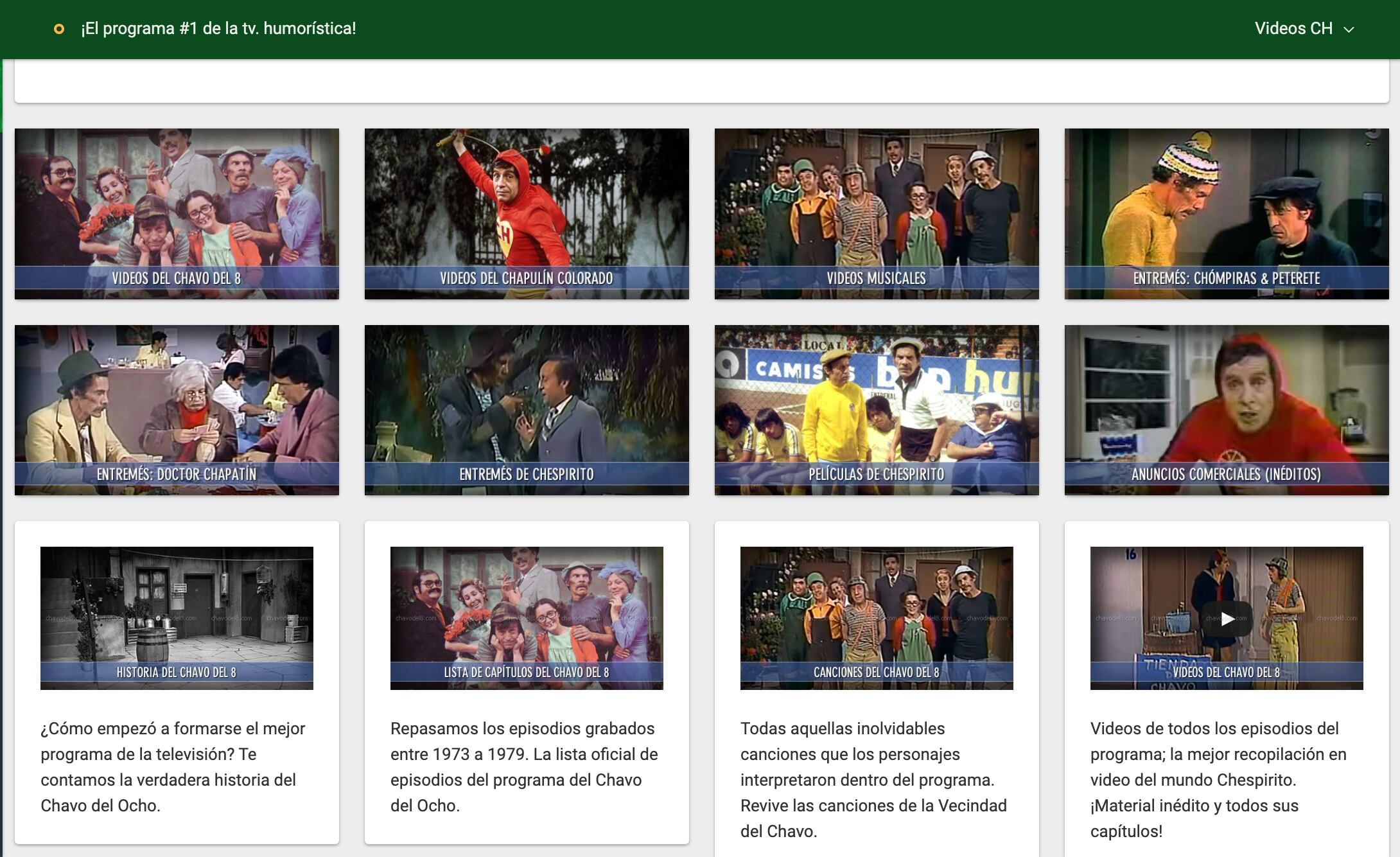 “Vecindad Ch”. Es una web bastante completa que incluye no solo los capítulos de “El Chavo del 8″ sino de todos los personajes creados por Chespirito así como comerciales, películas, etc, relacionados con este universo. Todo está debidamente ordenado por años, personajes y nombres de cada capítulo.