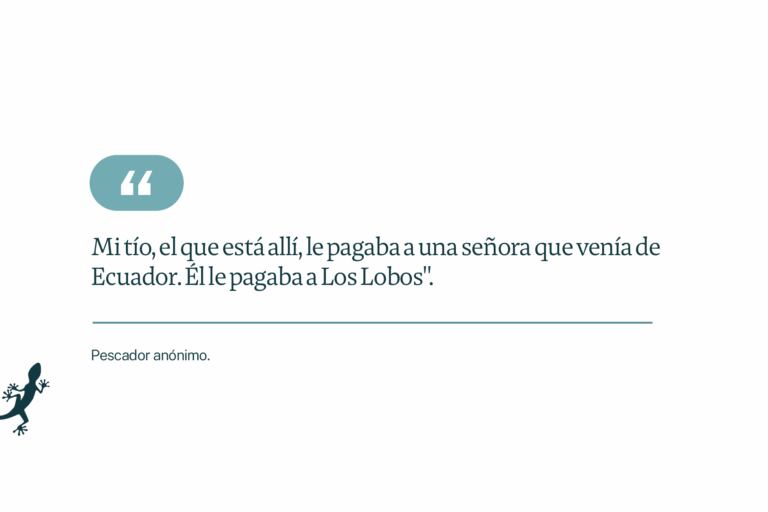 Cuando se le consulta a una de las autoridades policiales de la zona, que prefiere no identificarse, sobre estas posibles filtraciones, las niega rotundamente. “No hay filtraciones, casi todo el personal es nuevo, pero…”. El oficial duda por un momento, mira hacia un punto de la calle, y reanuda su relato con una advertencia. “Todo aquí es en reserva, hay información de un cobrador de cupos, pero nadie lo sindica. La realidad es que allá nadie los protege [a los pescadores]. La banda que les cobra cupos es la de Los Lobos. Los ecuatorianos”.