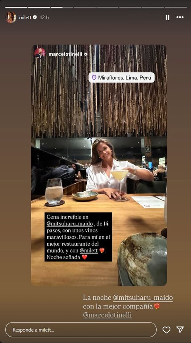 “Cena increíble en Maido, de 14 pasos con unos vinos maravillosos. Para mí en el mejor restaurante del mundo, y con Milett Figueroa. Noche soñada”, escribió Tinelli en su post, donde acompañó el mensaje con un emoji de corazón.