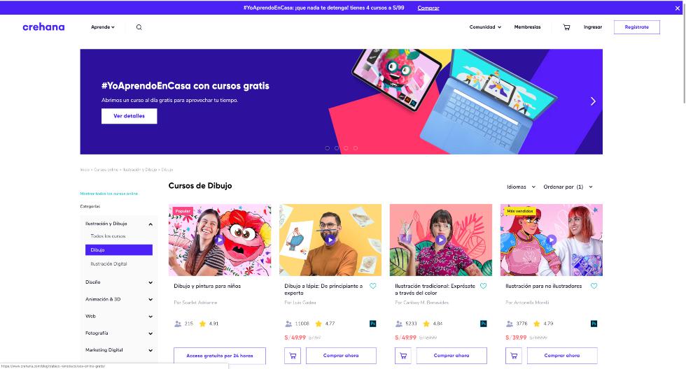 Gracias a este portal, los niños se divertirán aprendiendo dibujo y acuarela en un taller gratuito de tres horas. Los adolescentes pueden inscribirse en Ilustración tradicional y digital para cómics (dura cuatro horas). La herramienta es Photoshop, por lo que se requiere conocimiento básico del programa. Otra alternativa sin costo alguno: Fotografía con smartphone. Finalmente, para los adultos existen cursos como Diseño de Interiores: creando la identidad de un espacio o Emprender para ser feliz. El precio va desde S/39,99; no obstante, cada día anuncian talleres gratuitos. El plazo para matricularse: 24 horas.