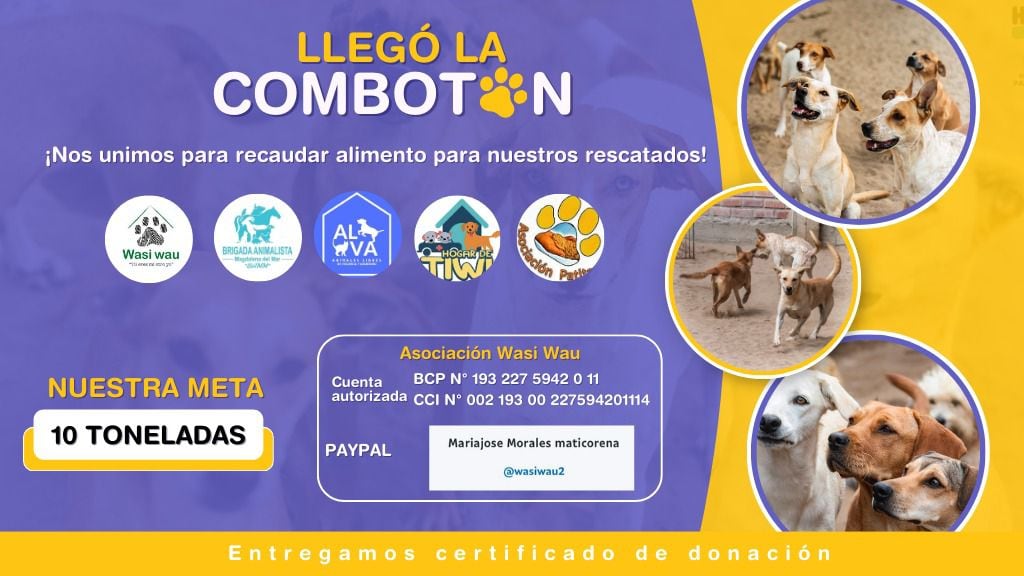 ¡La unión hace la fuerza! Eso lo saben bien los albergues Wasi wau, El hogar de Tiwi, Asociación ALVA, la Brigada Animalista de Magdalena y la Asociación Patitas, quienes acaban de unirse para la “Combotón”: iniciativa que tiene como objetivo recaudar 10 toneladas de comida para los perros que viven en los albergues.